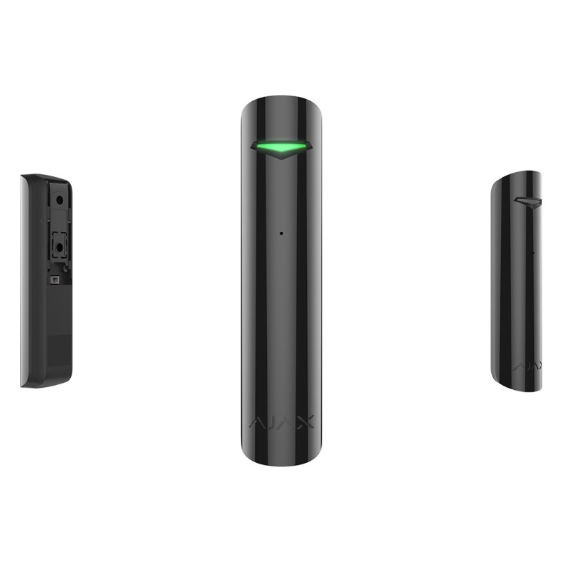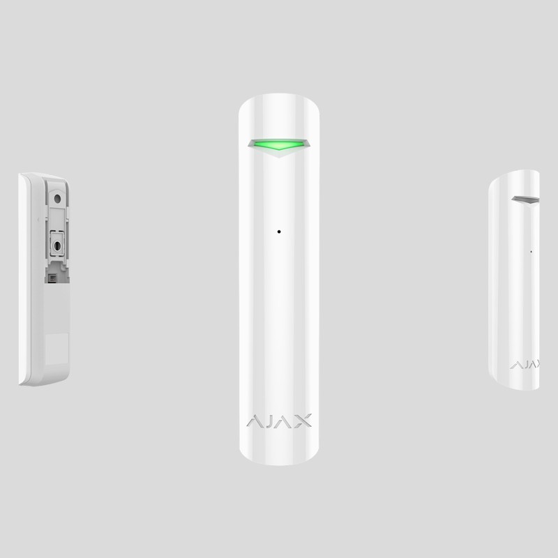 Detects broken glass using an electret microphone, which registers the sound of impact against the glass and of the glass falling.