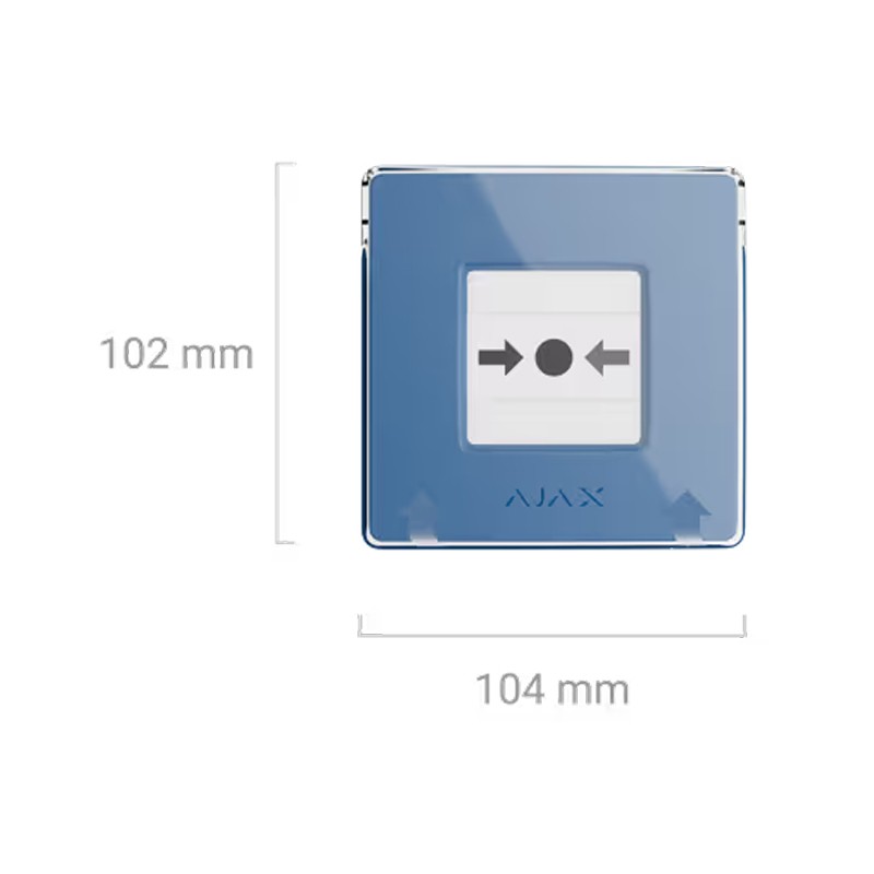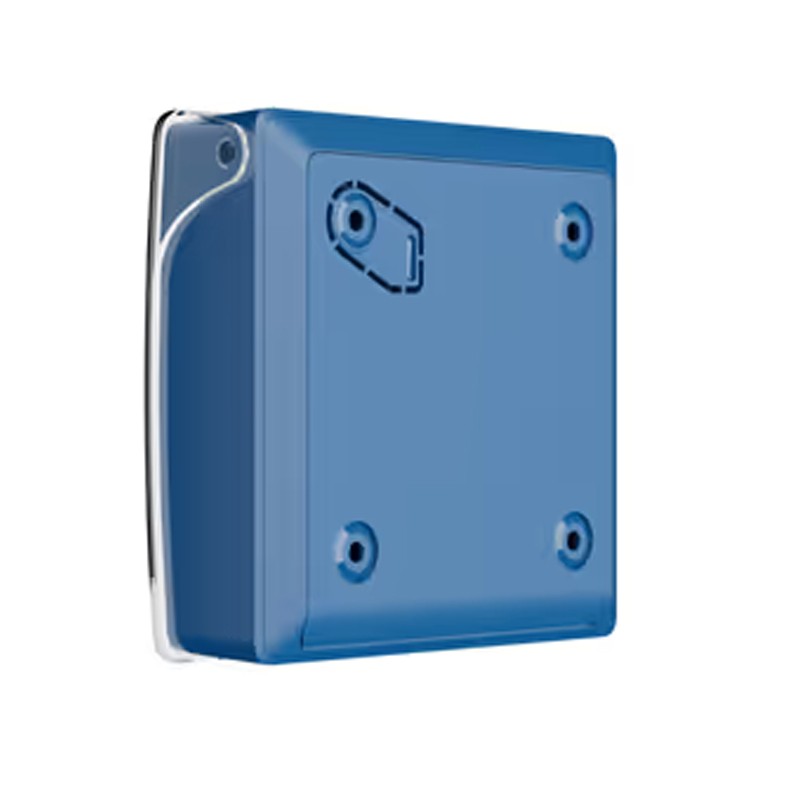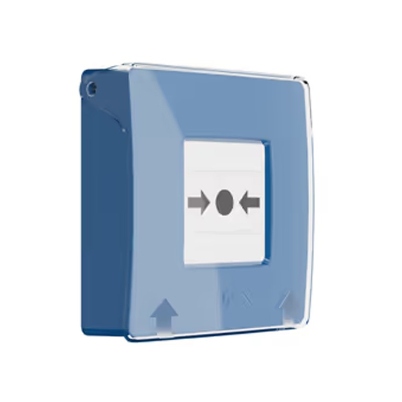 Wireless resettable button for manual fire alarm activation featuring programmable scenarios. Blue-colored version.